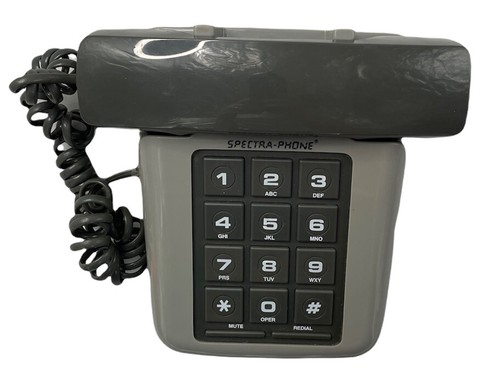 Classic 1980s desk phone with push-button dial. Sleek gray design with curly cord.