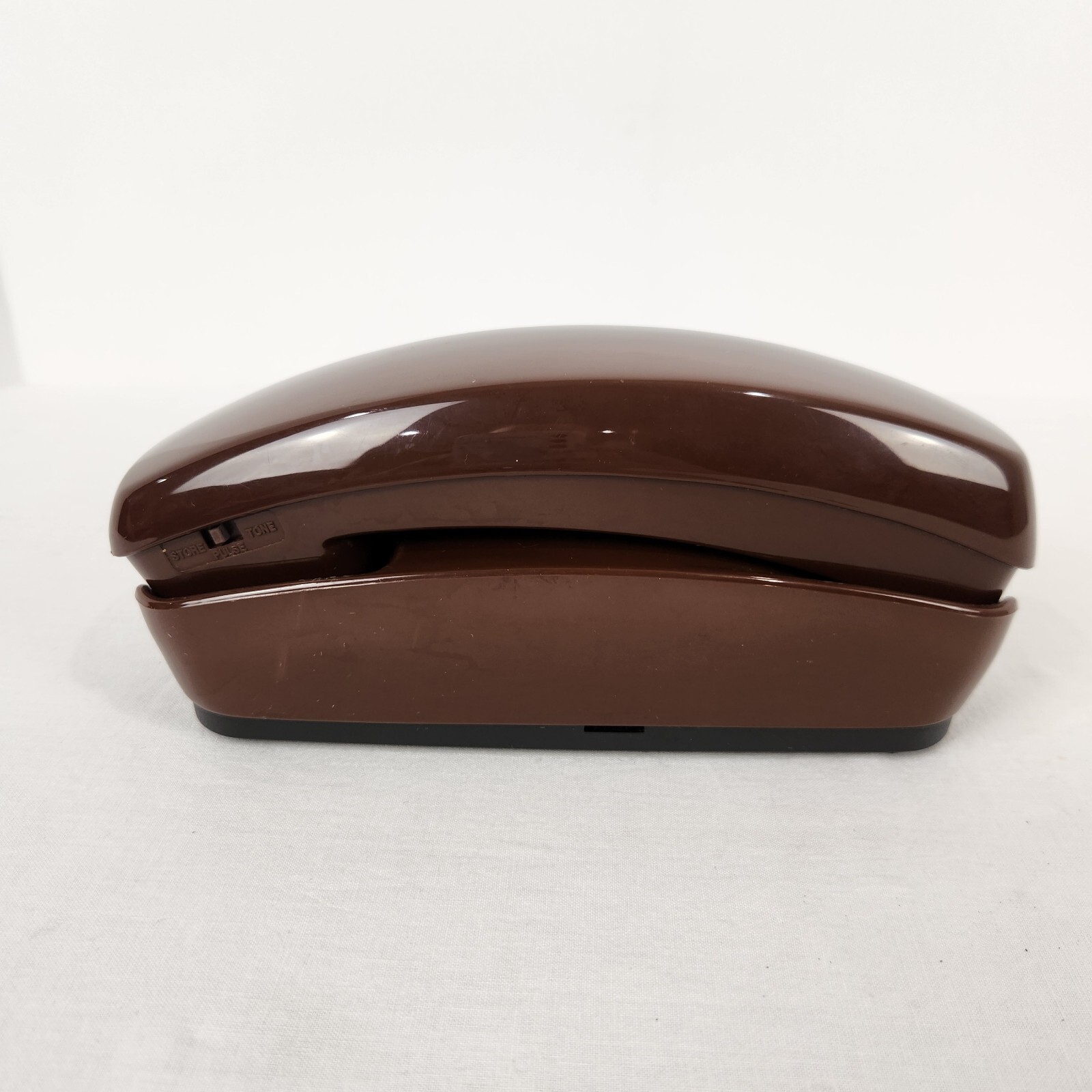 Elegant brown streamlined desk phone. Perfect retro aesthetic for any space.
