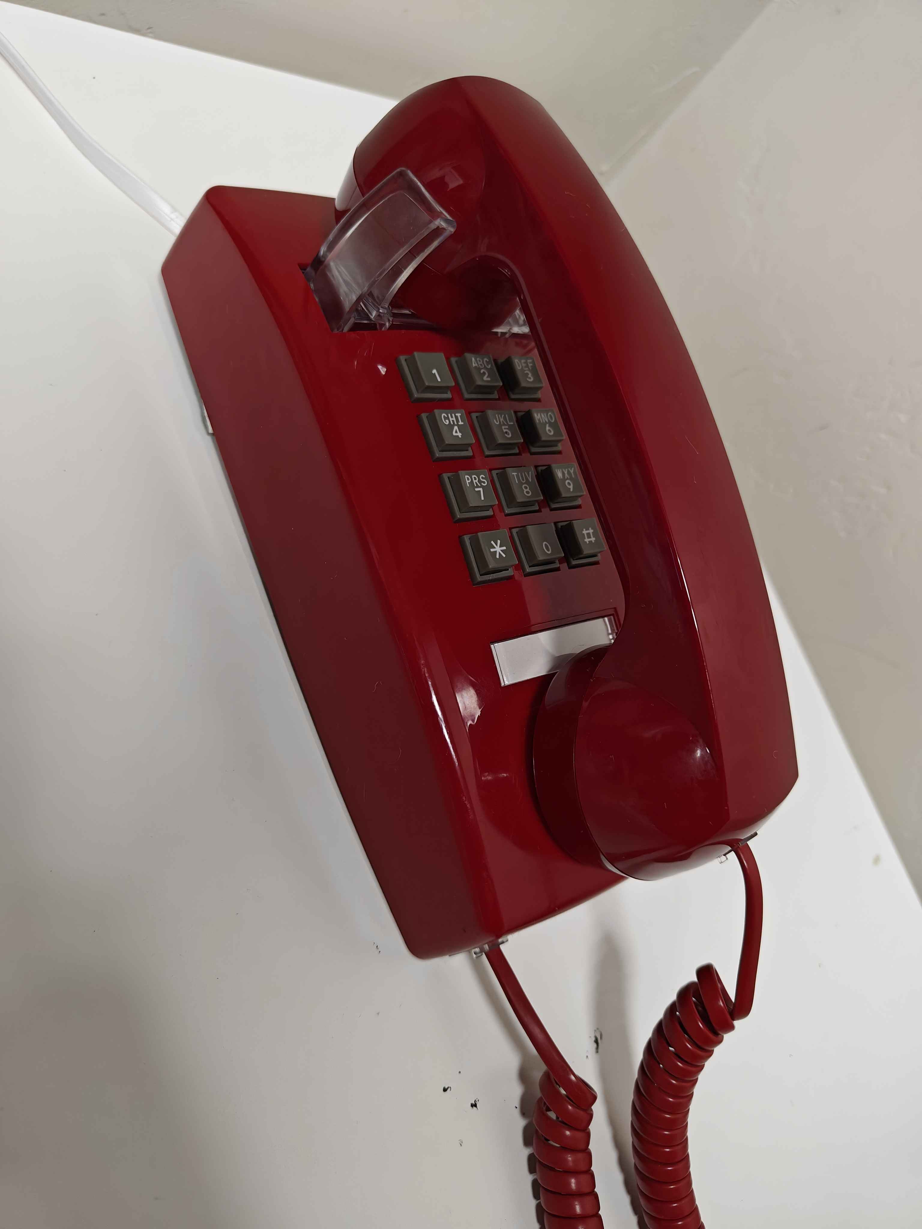 Bold red wall-mount phone with push buttons. Makes a statement!