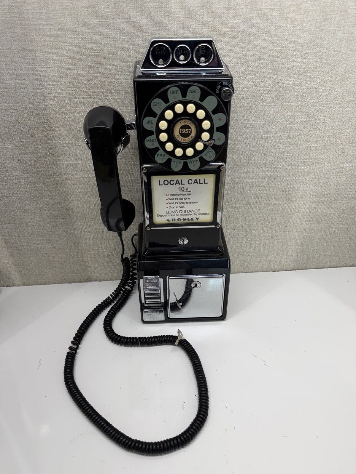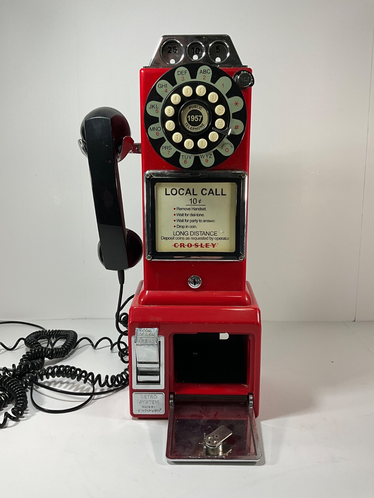 Classic replica payphone with rotary dial and coin slots. Nostalgic design for home or business.